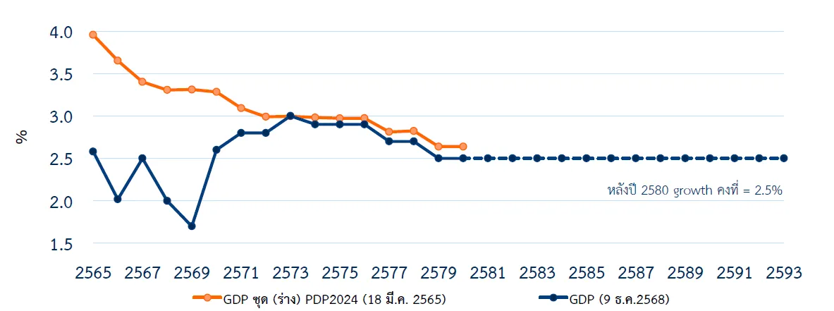 1. กรณีฐาน (BAU) หรือแนวโน้มปัจจุบัน โดยคาดว่าอัตราการเติบโตทางเศรษฐกิจ (GDP) ของไทย เฉลี่ยที่ 2.56% ลดลงจากแผนก่อนหน้าที่ 3.1% อ้างอิงข้อมูลจากสำนักงานสภาพัฒนาการเศรษฐกิจและสังคมแห่งชาติ (สภาพัฒน์) ณ วันที่ 9 ธ.ค. 2568 และจำนวนประชากรในประเทศ (รวมประชากรแฝง) ตั้งแต่ปี 2568 – 2569 สมมติฐานเติบโตเฉลี่ยลดลง 0.21% เหลืออยู่ที่ 66.5 ล้านคน อ้างอิงข้อมูลสภาพัฒน์ ณ วันที่ 10 ก.ย. 2568