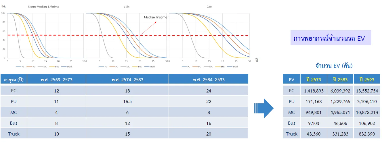 แต่เพิ่มปัจจัยเรื่องอายุการใช้งานของรถ EV อ้างอิงแนวโน้มเทคโนโลยีแบตเตอรี่ที่มีประสิทธิภาพดีขึ้นในอนาคต มาใช้ในการพยากรณ์ ซึ่งในช่วง 5 ปีแรก (พ.ศ. 2569–2573) กำหนดอายุการใช้งานรถยนต์นั่งส่วนบุคคล 12 ปี รถกระบะ 11 ปี รถจักรยานยนต์ 4 ปี รถโดยสาร 8 ปี และรถบรรทุก 10 ปี สำหรับช่วงปี พ.ศ. 2574–2583 กำหนดอายุการใช้งานทุกประเภทเพิ่มเป็น 1.5 เท่าของช่วง 5 ปีแรก และในช่วงปี พ.ศ. 2584–2593 เพิ่มเป็น 2 เท่าของช่วง 5 ปีแรก เพื่อสะท้อนอายุรถตามเทคโนโลยีที่พัฒนาดีขึ้น