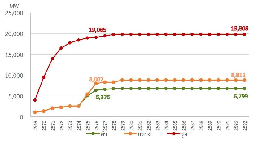 ภาพรวมความต้องการใช้ไฟฟ้าของประเทศมีแนวโน้มเติบโตในอัตราที่ชะลอตัวลงอย่างต่อเนื่อง ส่งผลให้การพยากรณ์ในกรณีต่ำ (Low) คาดว่า ความต้องการไฟฟ้าสูงสุดจะเพิ่มจากประมาณ 36,450 เมกะวัตต์ ในปี 2569 เป็น 71,340 เมกะวัตต์ ในปี 2593 หรือเติบโตเฉลี่ยร้อยละ 2.9 ต่อปี โดยมีการใช้ไฟฟ้าปี 2593 อยู่ที่ 386,081 ล้านหน่วย ขณะที่กรณีสูง (High) ความต้องการไฟฟ้าสูงสุดในปี 2593 จะเพิ่มเป็น 77,374 เมกะวัตต์ หรือเติบโตเฉลี่ยร้อยละ 3.2 ต่อปี และมีการใช้ไฟฟ้าอยู่ที่ 434,371 ล้านหน่วย โดยมีปัจจัยหลักจากการขยายตัวของ EV และ Data Center