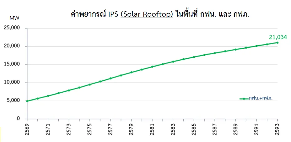 การผลิตไฟฟ้าเพื่อใช้เอง (IPS) คาดว่าความต้องการใช้ไฟฟ้าในปี 2593 จะอยู่ที่ 19,965 เมกะวัตต์ โดยอ้างอิงแนวโน้มโซลาร์รูฟท็อป (Solar Rooftop) และ โซลาร์ลอยน้ำ (Solar Floating) ในระบบ กฟน. และ กฟภ. จะมีการเติบโตอย่างมากในอนาคตจากการสนับสนุนด้านนโยบายของภาครัฐ อาทิ การส่งเสริมพลังงานหมุนเวียนเพื่อบรรลุเป้าหมาย Net Zero และการเปิดให้มีการซื้อขายไฟฟ้าผ่านระบบ Third Party Access (TPA) รวมถึงแนวโน้มการพัฒนาเทคโนโลยี โดยเฉพาะการติดตั้งระบบ Solar Rooftop ควบคู่กับระบบกักเก็บพลังงาน (BESS)