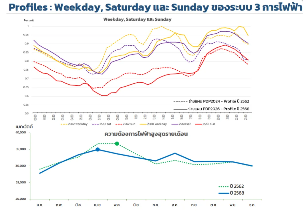 นอกจากนี้ ยังพบพิจารณาพฤติกรรมการใช้ไฟฟ้าที่เปลี่ยนแปลงไป โดยเฉพาะช่วงเวลาการใช้ไฟฟ้าสูงสุด (Peak) ที่เปลี่ยนจากช่วงกลางวันเวลา 14.00 น. เป็นช่วงกลางคืน 21.00 น. จากการชาร์จ EV และการใช้ไฟฟ้าในภาคธุรกิจยุคดิจิทัล ขณะเดียวกันการวางแผนระบบไฟฟ้าในระยะต่อไปยังต้องคำนึงถึงมาตรการเชิงนโยบายที่จำเป็นในอนาคต เช่น การปรับโครงสร้างอัตราค่าไฟฟ้า การลงทุนในโครงสร้างพื้นฐานเพื่อรองรับการเติบโตของ Data Center การส่งเสริมการผลิตไฟฟ้าเพื่อใช้เอง ตลอดจนการเปิดให้มีการใช้โครงข่ายไฟฟ้าร่วมกัน (Third Party Access: TPA)