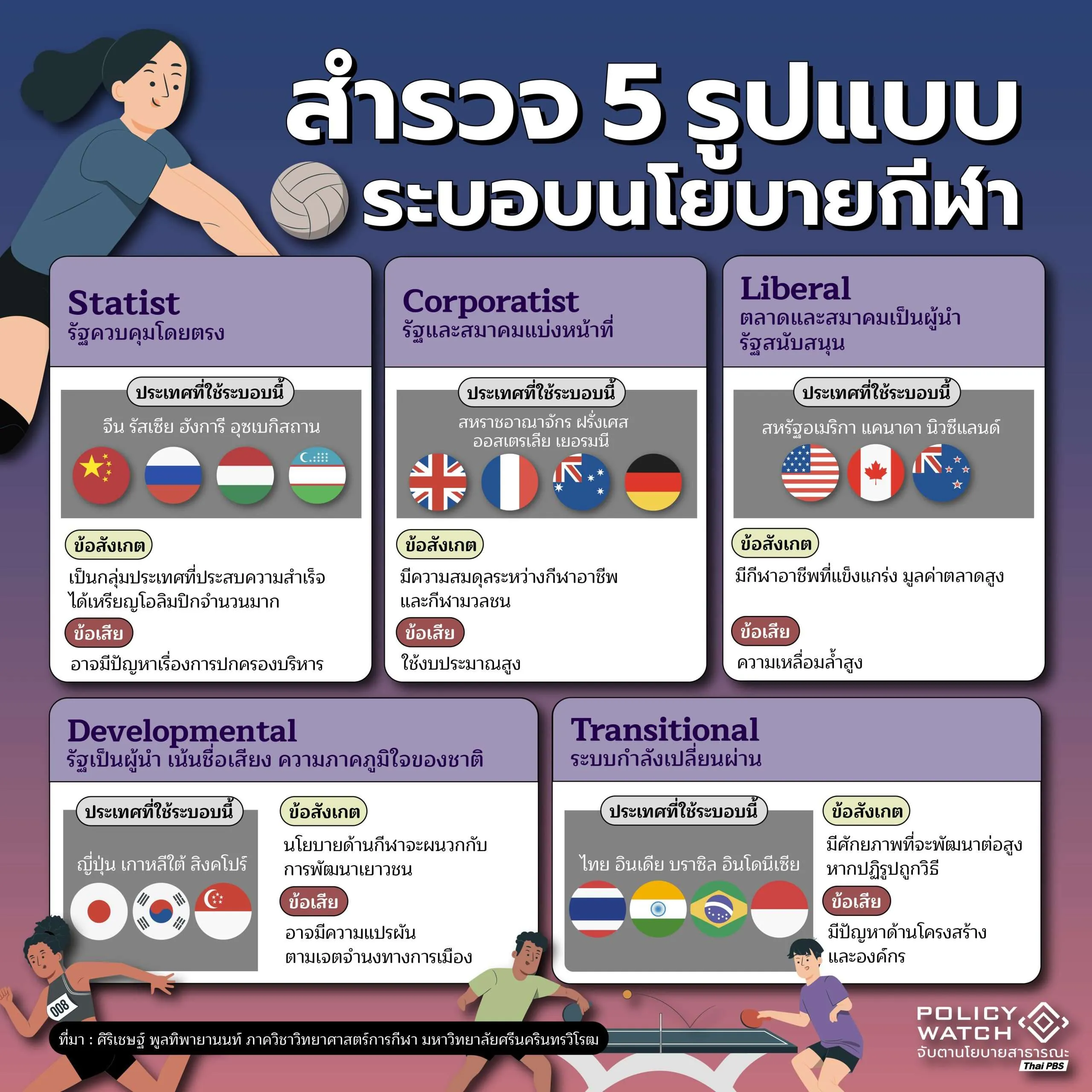 - ระบอบ Developmental รัฐเป็นผู้นำ โดยจะเน้นชื่อเสียงและความภาคภูมิใจของชาติ ประเทศที่โดดเด่นและใช้ระบอบนี้คือ ญี่ปุ่น เราอาจจะเคยได้ยินคำว่า Japan’s Way มาบ้าง ซึ่งเป็นแนวทางที่ประเทศญี่ปุ่นใช้สร้างระบบนิเวศกีฬาที่แข็งแรงตั้งแต่ระดับโรงเรียนไปจนถึงกีฬาอาชีพ เน้นการสร้างและพัฒนาโครงสร้างพื้นฐาน ประเทศที่ใช้ระบอบนี้อีกคือ เกาหลีใต้และสิงคโปร์ โดยนโยบายด้านกีฬาต่างๆ มักจะไปถูกผนวกไปกับการพัฒนาเยาวชน แต่ข้อเสียคืออาจมีความเปลี่ยนแปลงตามเจตจำนงทางการเมือง (political will)