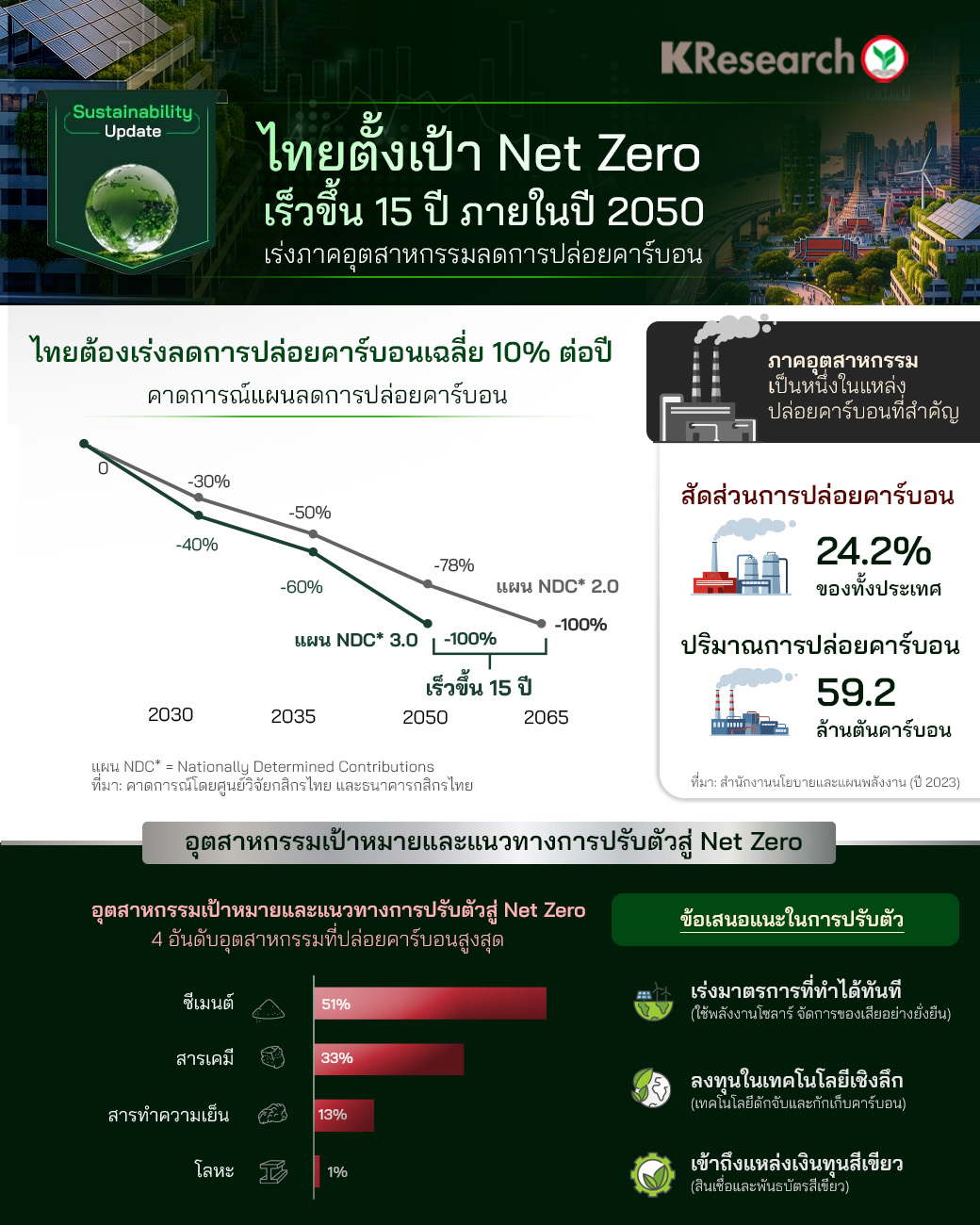 ทางหน่วยงายวิจัยของธนาคารกสิกร KResearch ชี้ให้เห็นว่าถ้าไทยจะบรรลุเป้าหมาย Net Zero 2050 ไทยต้องลดการปล่อยคาร์บอนประมาณ 10% ต่อปี โดยภาคอุตสาหกรรมเป็นภาคที่มีการปล่อยคาร์บอนมากที่สุดในประเทศคิดเป็น 24.2% หรืออยู่ที่ 59.2 ล้านตันคาร์บอน ซึ่งมีความเป็นไปได้สูงที่ภาคอุตสาหกรรมโดยเฉพาะผู้ผลิตซีเมนต์ สารเคมี สารทำความเย็น และโลหะ จะถูกกดดันให้เร่งปรับตัว