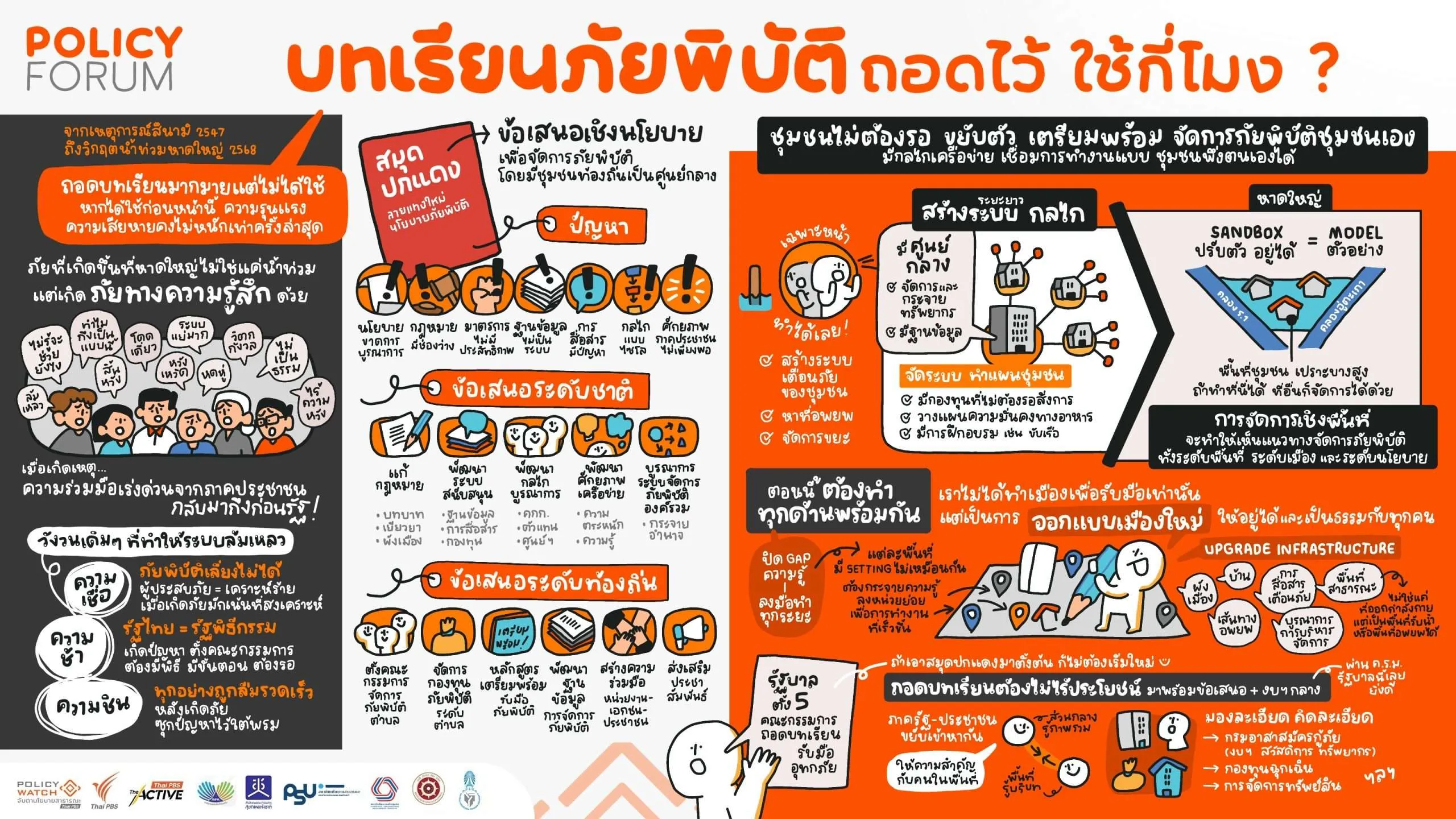 Policy Watch – The Active ไทยพีบีเอส จึงร่วมกับสำนักงานคณะกรรมการสุขภาพแห่งชาติ มหาวิทยาลัยทักษิณ สถาบันนโยบายสาธารณะมหาวิทยาลัยสงขลานครินทร์ และภาคีเครือข่าย เปิดพื้นที่สนทนาสาธารณะ “Policy Forum บทเรียนภัยพิบัติ: ถอดไว้ … ใช้กี่โมง” ชวนทุกภาคส่วนที่เกี่ยวข้องมาแลกเปลี่ยนความเห็น สะท้อนต้นทุน ข้อจำกัด และออกแบบแนวทางการผลักดันให้การจัดการภัยพิบัติที่มีชุมชนท้องถิ่นเป็นฐาน เดินหน้าไปสู่การ “ลงมือทำ” ที่เป็นจริง