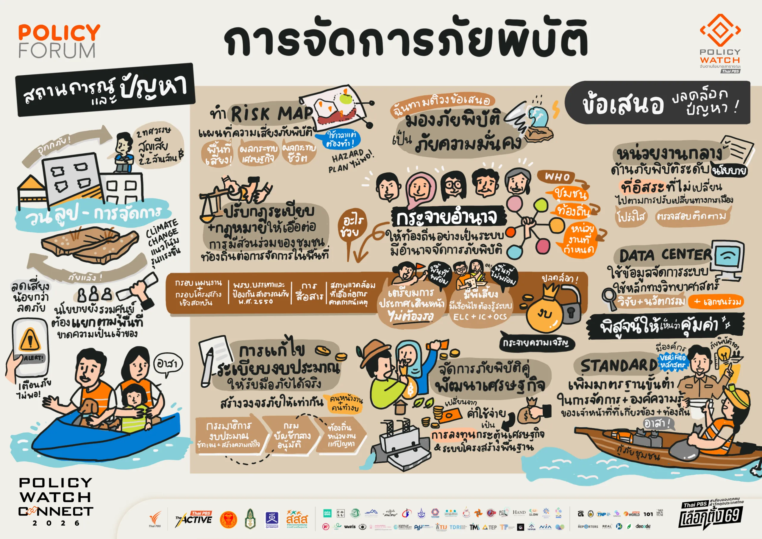 เวทีการออกแบบนโนบายการจัดการภัยพิบัติ ได้สะท้อนสถานการณ์และผลกระทบของภัยพิบัติในประเทศไทยไม่ใช่เหตุการณ์เฉพาะหน้าอีกต่อไป แต่เป็นความเสี่ยงเชิงโครงสร้างที่สะสมและทวีความรุนแรงขึ้นอย่างต่อเนื่อง