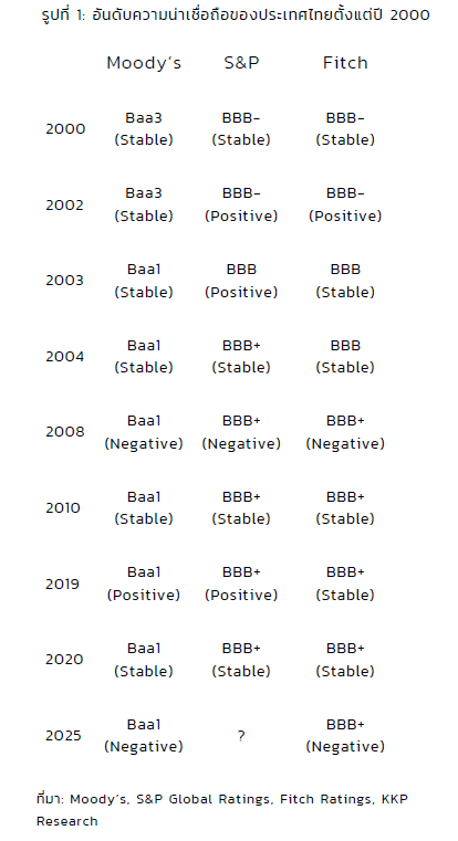 ประเด็นดังกล่าวเริ่มกลับมาได้รับความสนใจอีกครั้ง หลังจากที่บริษัทจัดอันดับเครดิต (Credit rating agency) สําคัญทั้ง Moody’s และ Fitch Ratings ออกมาปรับมุมมองต่อความน่าเชื่อถือด้านการคลังของไทย ลงจากมีเสถียรภาพหรือ “Stable” เป็นลบ หรือ “Negative” (และมีโอกาสที่ S&P Global Ratingsจะปรับตามมาเร็ว ๆ นี้) เป็นการส่งสัญญาณที่ชัดเจนว่าถ้าไม่มีการเปลี่ยนแปลงอะไร โอกาสที่ประเทศไทยจะถูกปรับลดอันดับความน่าเชื่อถือมีมากกว่าโอกาสจะปรับเพิ่ม
