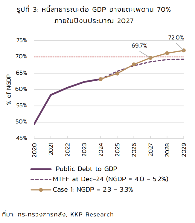 การขาดดุลงบประมาณที่เพิ่มขึ้นอย่างต่อเนื่องส่งผลให้หนี้สาธารณะเพิ้มขึ้นด้วยเช่นกัน KKP Research ประเมินว่าหนี้สาธารณะต่อ GDP มีโอกาสจะแตะเพดาน 70% ภายในปีงบประมาณ 70 (2027) เร็วกว่าการประเมินของกระทรวงคลังล่าสุดในปีที่แล้ว ที่คาดว่าจะไป “เฉียด” เพดานในช่วงปีงบประมาณ 72 (2029) เพราะการเจริญเติบโตทางเศรษฐกิจที่ชะลอตัวลง