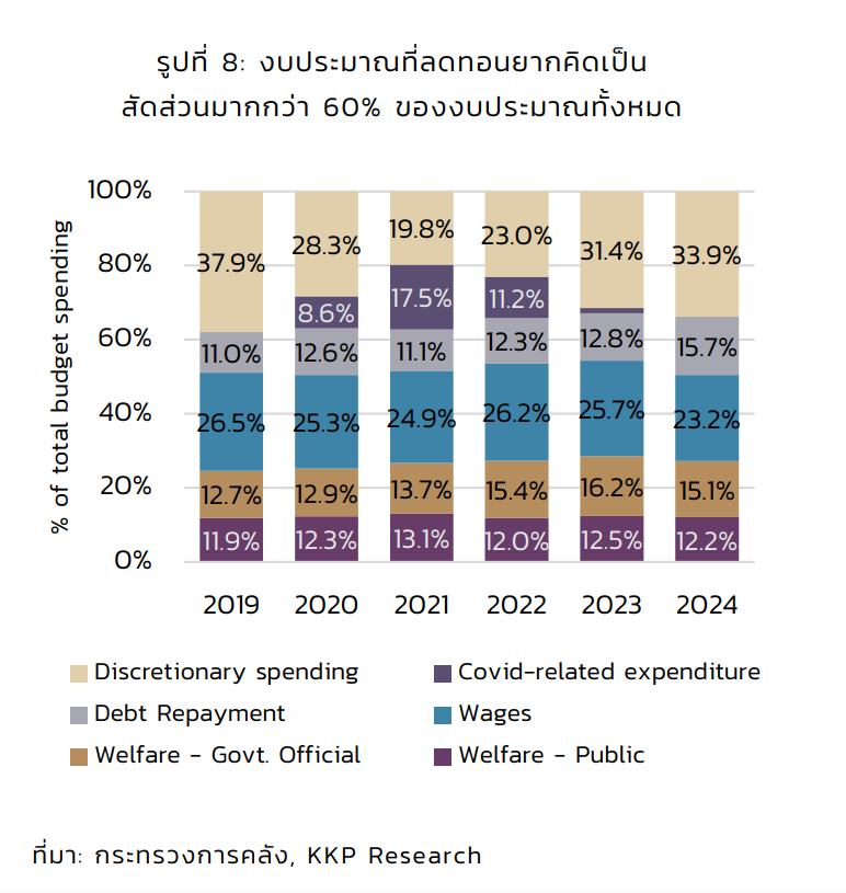 อย่างไรก็ตาม สังคมผู้สูงอายุที่กําลังเร่งตัวขึ้น จะทําให้สัดส่วนเพิ่มขึ้นไปอีก โดย KKP Research เคยประเมินไว้ว่างบสวัสดิการจะเพิ่มขึ้นเรื่อย ๆ อย่างต่อเนื่อง และภายในอีก 15 ปีข้างหน้างบสวัสดิการของข้าราชการและประชาชนจะเพิ่มขึ้นจากประมาณ 25% เป็น 35% ของงบประมาณทั้งหมด