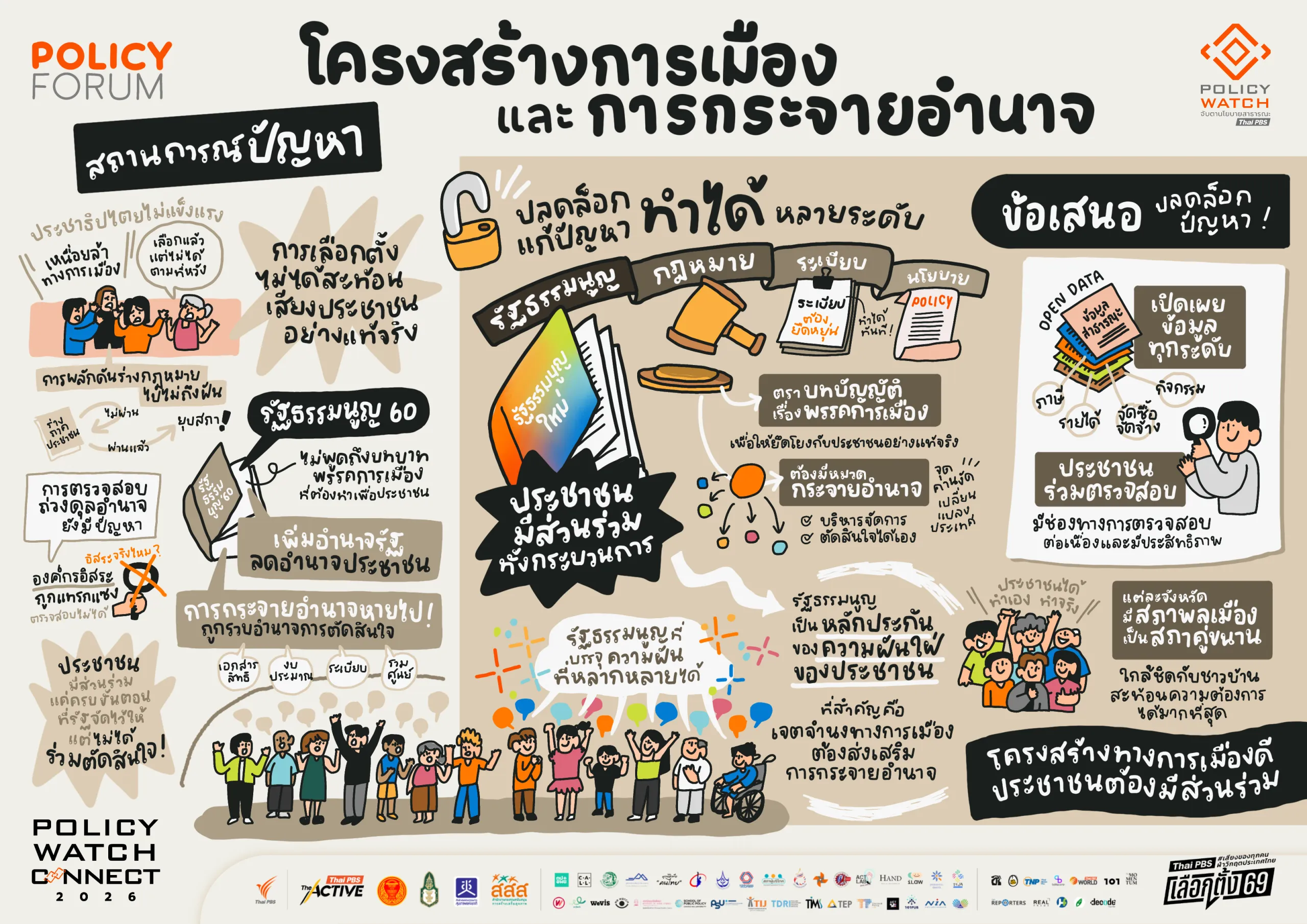 ในงาน Policy Watch Connect 2026 ที่รัฐสภา นอกเหนือจาก Policy Communication : Exhibition ที่บริเวณสระมรกต ที่ให้ผู้ที่สนใจเข้าชมนิทรรศการ “หน้าตาคนจนเมือง” และแปลงปัญหาไปสู่นโยบายสาธารณะ และวิธีแก้ไขที่ทำได้จริง ในวันที่ 13 ม.ค.69 ที่ผ่านมายังมีเวที Policy Forum หัวข้อ “โครงสร้างการเมืองและการกระจายอำนาจ” โดยมีผู้ร่วมถกแถลง แลกเปลี่ยนมุมมองจากทั้งฝ่ายวิชาการ และภาคประชาสังคม