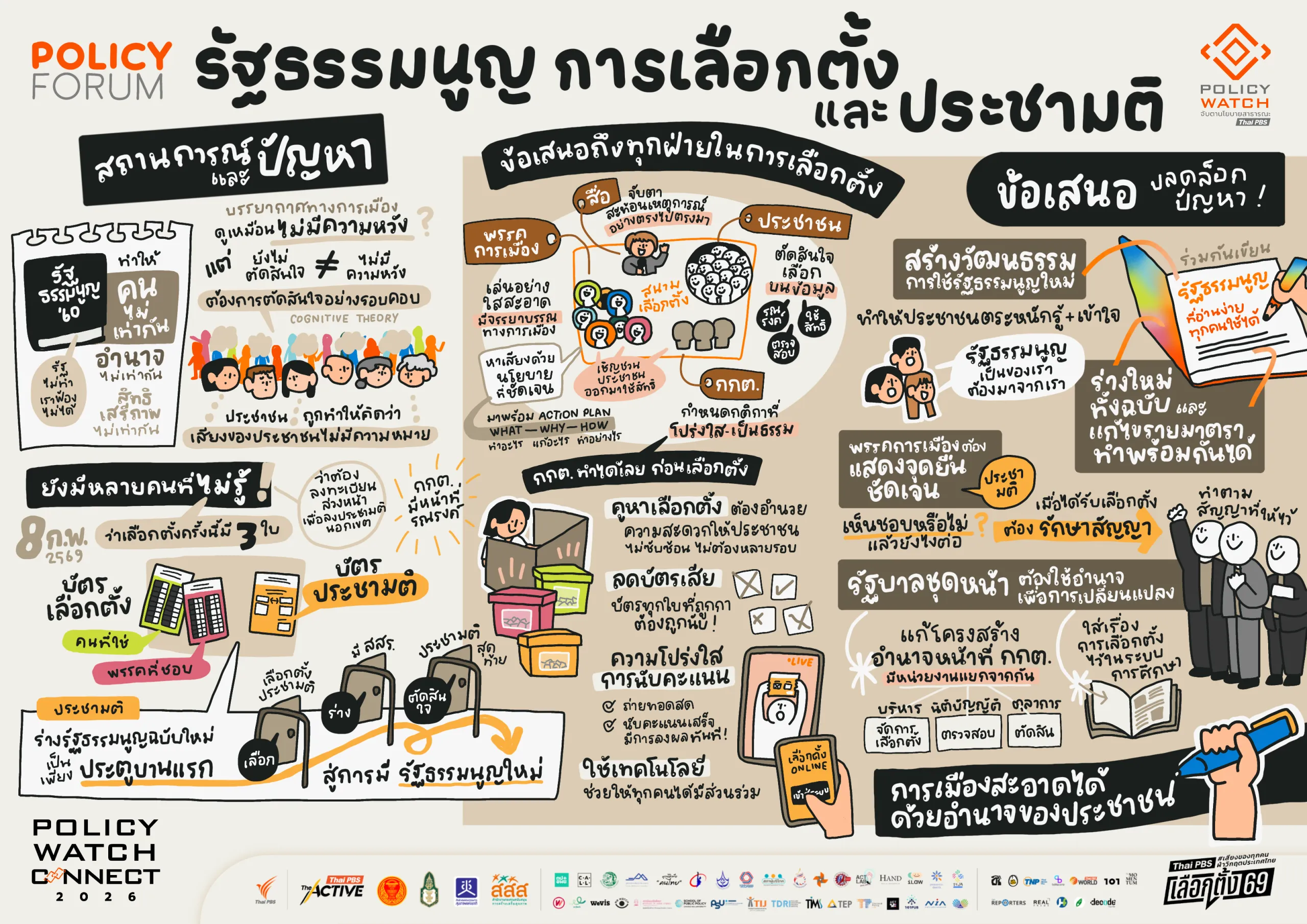 จากงาน #PolicyWatchConnect2026 ‘เลือกตั้ง 69 นโยบายสาธารณะ ฝ่าวิกฤตประเทศ’ จึงมีกิจกรรม Policy Forum: รัฐธรรมนูญ การเลือกตั้ง และประชามติ เมื่อวันที่ 13 ม.ค.69 เป็นอีกเวทีสนทนาเพื่อถอดบทเรียนและเสนอแนวทางสร้างกลไกฝ่าวิกฤต โดยมี policy Watch The Active ไทยพีบีเอส และองค์กรเครือข่ายกว่า 40 องค์กร ร่วมกันจัดขึ้น