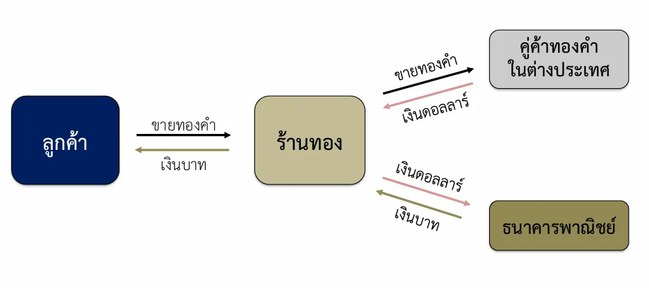 ความผันต่อค่าเงินบาทจากการซื้อขาย ในกรณีที่ราคาทองคคำในตลาดโลกราคาสูงขึ้น นักลงทุนในประเทศจะขายทงอคำออกมาผ่านร้านทอง จากนั้นร้านทองก็จะไปขายต่อให้กับผู้ค้าทองคำในต่างประเทศ โดยได้รับเงินเป็น “เงินดอลลาร์” ซึ่งต่อมาต้องแลกเป็นเงินบาท เพื่อชำระคืนผู้ขายในประเทศ และส่งผลให้ค่าเงินบาท “แข็งค่าขึ้น” จากความต้องการ “เงินบาท”