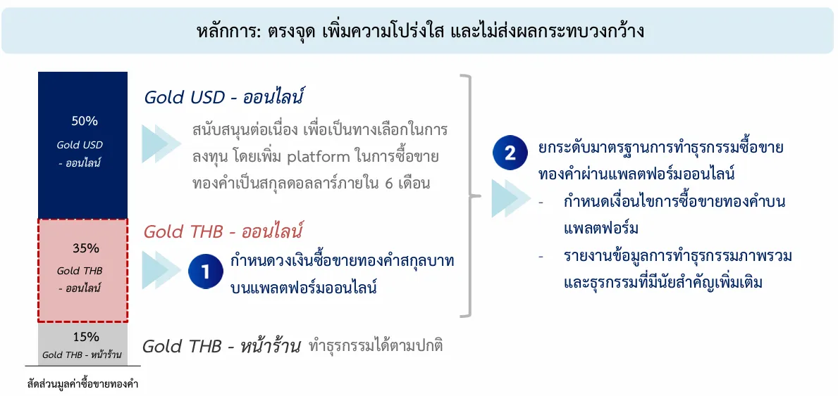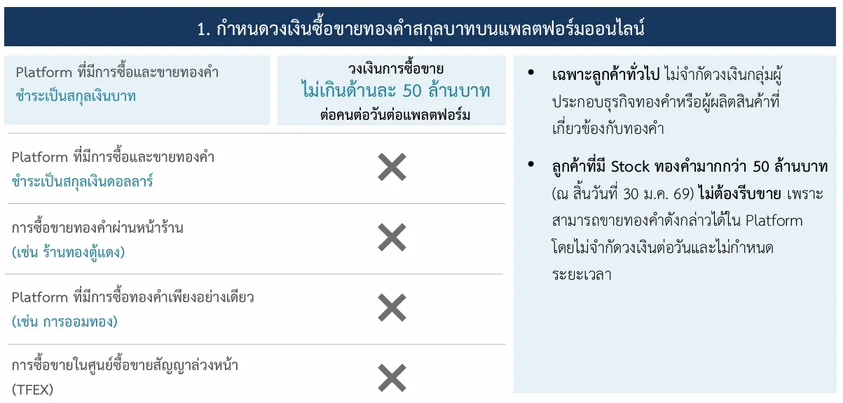 1. กำหนดวงเงินการซื้อหรือขายทองคำ ไม่เกินด้านละ 50 ล้านบาท/คน/แพลตฟอร์ม บนแพลตฟอร์มที่ชำระเป็นสกุลบาทเท่านั้น (ไม่ครอบคลุมการซื้อขายทองคำที่ชำระเป็นสกุลเงินดอลลาร์สหรัฐฯ การซื้อขายผ่านร้านทองทั่วไป การซื้อบนแพลตฟอร์มที่มีลักษณะออมทอง [ที่ไม่สามารถขายได้] หรือการซื้อขายในศูนย์ซื้อขายสัญญาล่วงหน้า (TFEX))