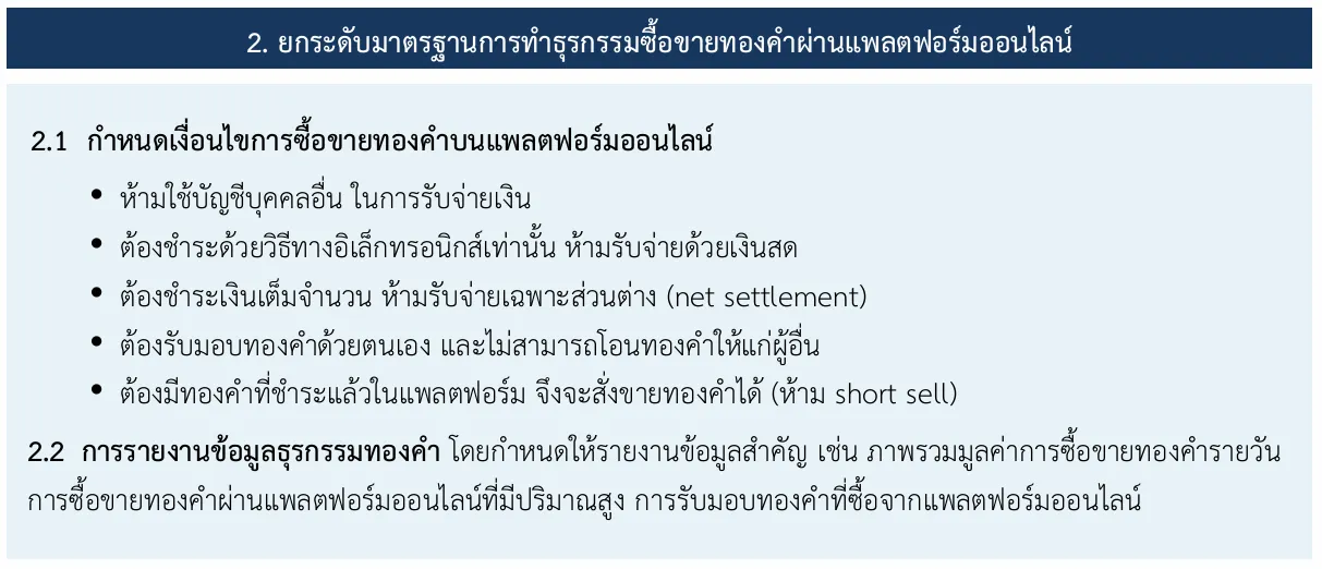 2. กำหนดเงื่อนไขเพิ่มเติมสำหรับการซื้อขายทองคำบนแพลตฟอร์ม (ทั้งสกุลบาทและดอลลาร์) ได้แก่ (1) ห้ามใช้บัญชีบุคคลอื่นในการรับจ่ายเงินแทน (2) ให้ชำระเงินด้วยวิธีทางอิเล็กทรอนิกส์เท่านั้น (3) ให้ชำระเงินเต็มจำนวนโดยห้ามรับจ่ายเฉพาะส่วนต่าง (net settlement) (4) ต้องรับมอบทองคำด้วยตนเอง และ (5) การขายทองคำจะต้องมีทองคำที่ชำระเงินครบถ้วนแล้วในแพลตฟอร์มก่อนเท่านั้น (ห้าม short sell)