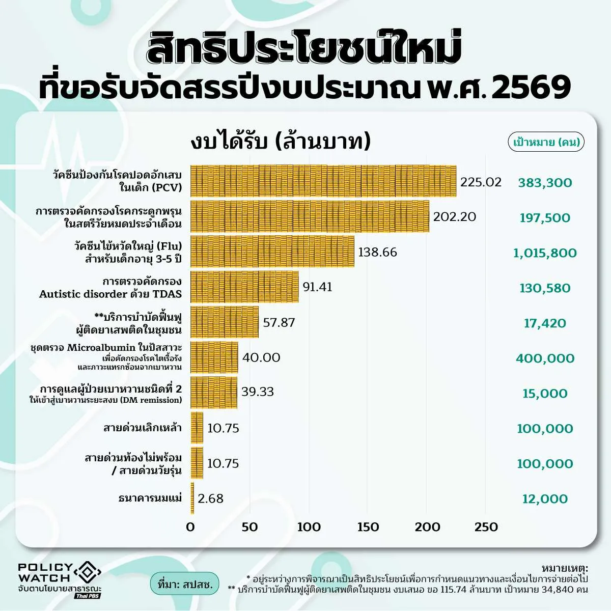 ทั้งนี้ งบกองทุนบัตรทองปี 2569 เพิ่มขึ้นจาก ปี 2568 ประมาณ 15% เนื่องจากมีกลุ่มเป้าหมายประชาชนผู้มารับบริการเพิ่มขึ้น และมีการเพิ่มการเข้าถึงบริการในรูปแบบใหม่ ไม่ว่าจะเป็นระบบการแพทย์ทางไกล (Telemedicine) ฯลฯ ไปจนถึงสิทธิประโยชน์ใหม่ อาทิ การเพิ่มบริการถ่ายภาพจอประสาทตาในกลุ่มผู้ป่วยเบาหวานชนิดที่ 2 บริการบำบัดฟื้นฟูผู้ติดยาเสพติดในชุมชน ฯลฯ อีกทั้ง ยังได้มีการเพิ่มงบประมาณในการสร้างเสริมสุขภาพและป้องกันโรค (P&P) โดยเฉพาะการใช้ควบคุมโรคไม่ติดต่อเรื้อรัง (NCDs) ด้วย